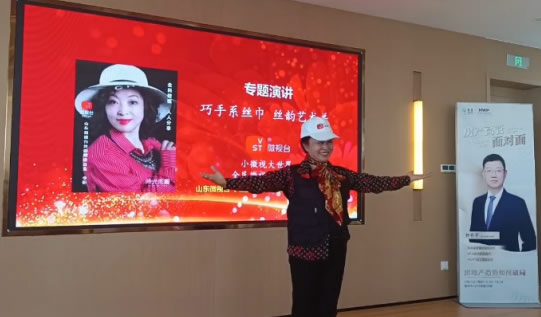 山东微视台《丝韵》频道总监兼制片人李昕做了“巧手系丝巾,丝韵艺术美”的主题演讲和表演。