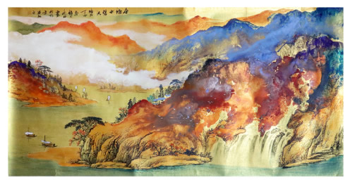 金 塘 水碧流 年代 : 现代 材质: 纸本设色 尺寸:长133.5cm宽66.5cm 代理公司: 赏析 APPRECIATION 《 金塘水碧流 》张斌大师这里新宫廷工笔花鸟的表现形式,是在工笔画历史上的又一次重大的突破。尤其是他的山水画,晕染精微,构图饱满,色彩深沉富于内涵,...